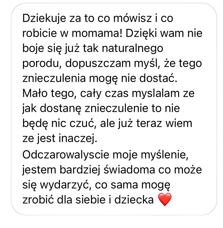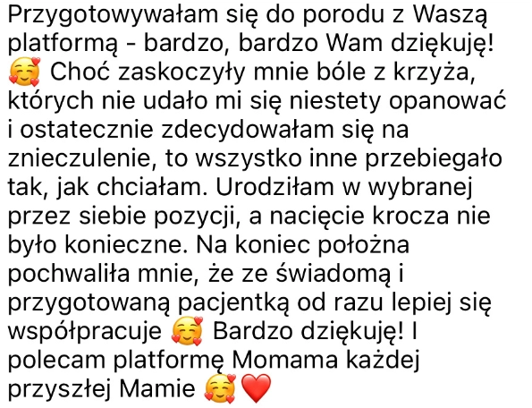 Przygotowywałam się do porodu z Waszą platformą - bardzo, bardzo Wam dziękuję! 🥰 Choć zaskoczyły mnie bóle z krzyża, których nie udało mi się niestety opanować i ostatecznie zdecydowałam się na znieczulenie, to wszystko inne przebiegało tak, jak chciałam. Urodziłam w wybranej przez siebie pozycji, a nacięcie krocza nie było konieczne. Na koniec położna pochwaliła mnie, że ze świadomą i przygotowaną pacjentką od razu lepiej się współpracuje 🥰 Bardzo dziękuję! I polecam platformę Momama każdej przyszłej Mamie 🥰❤️"Wasza platforma zmieniła moje życie"