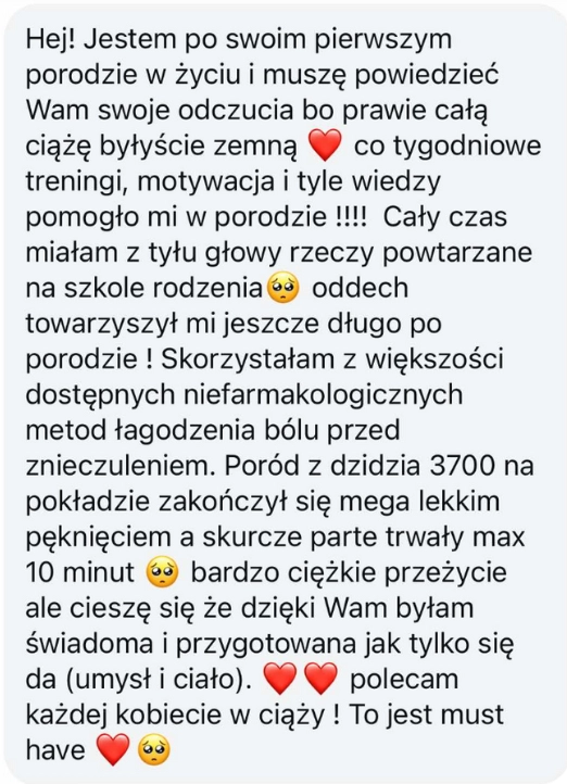 Hej! Jestem po swoim pierwszym porodzie w życiu i muszę powiedzieć Wam swoje odczucia bo prawie całą ciążę byłyście ze mną ❤️ co tygodniowe treningi, motywacja i tyle wiedzy pomogło mi w porodzie !!!! Cały czas miałam z tyłu głowy rzeczy powtarzane na szkole rodzenia🥺 oddech towarzyszył mi jeszcze długo po porodzie ! Skorzystałam z większości dostępnych niefarmakologicznych metod łagodzenia bólu przed znieczuleniem. Poród z dzidzią 3700 na pokładzie zakończył się mega lekkim pęknięciem a skurcze parte trwały max 10 minut 🥺 bardzo ciężkie przeżycie ale cieszę się że dzięki Wam byłam świadoma i przygotowana jak tylko się da (umysł i ciało). ❤️❤️ polecam każdej kobiecie w ciąży ! To jest must have ❤️🥺"Pojechałam na porodówkę z uśmiechem i ekscytacją"