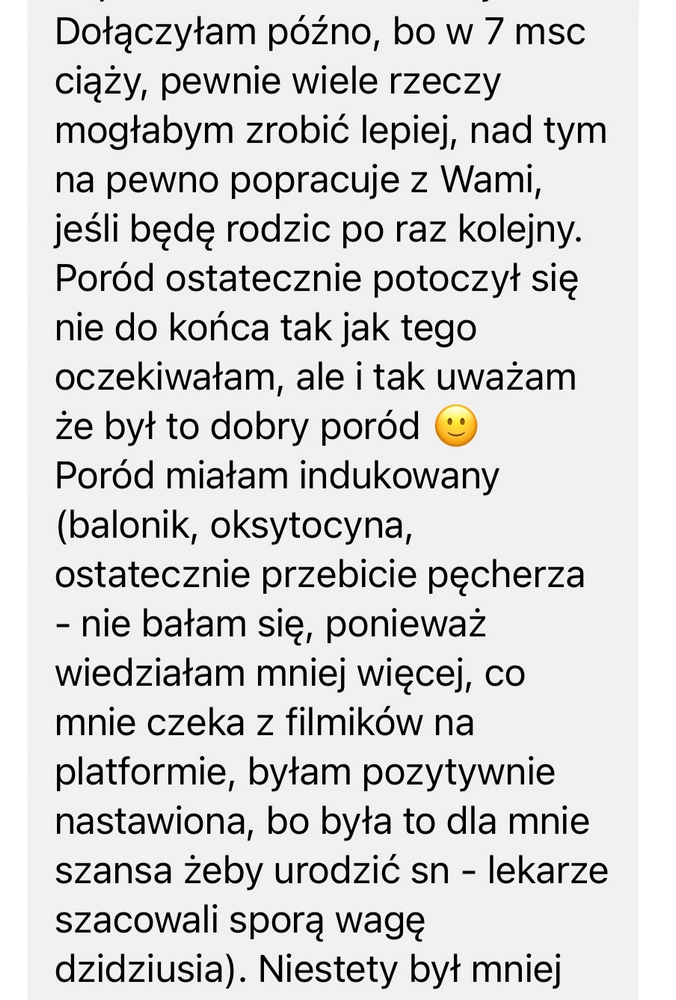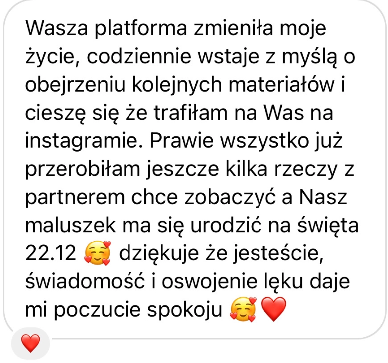 Wasza platforma zmieniła moje życie, codziennie wstaje z myślą o obejrzeniu kolejnych materiałów i cieszę się że trafiłam na Was na instagramie. Prawie wszystko już przerobiłam jeszcze kilka rzeczy z partnerem chce zobaczyć a Nasz maluszek ma się urodzić na święta 22.12 🥰💕 dziękuje że jesteście, świadomość i oswojenie lęku daje mi poczucie spokoju 🥰❤️"Dzięki Wam byłam świadoma i przygotowana jak tylko się da!"