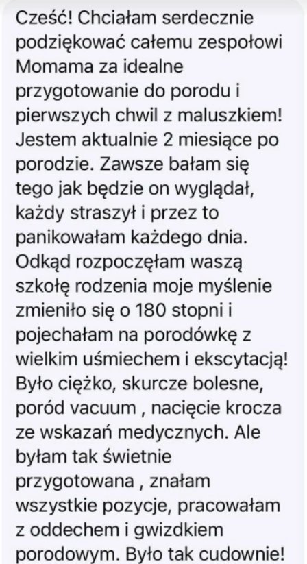 Cześć! Chciałam serdecznie podziękować całemu zespołowi Momama za idealne przygotowanie do porodu i pierwszych chwil z maluszkiem! Jestem aktualnie 2 miesiące po porodzie. Zawsze bałam się tego jak będzie on wyglądał, każdy straszył i przez to panikowałam każdego dnia. Odkąd rozpoczęłam waszą szkołę rodzenia moje myślenie zmieniło się o 180 stopni i pojechałam na porodówkę z wielkim uśmiechem i ekscytacją! Było ciężko, skurcze bolesne, poród vacuum, nacięcie krocza ze wskazań medycznych. Ale byłam tak świetnie przygotowana, znałam wszystkie pozycje, pracowałam z oddechem i gwizdkiem porodowym. Było tak cudownie!Historie Mam, które zaufały Momama – przeczytaj jak szkoła rodzenia online pomaga mamom
