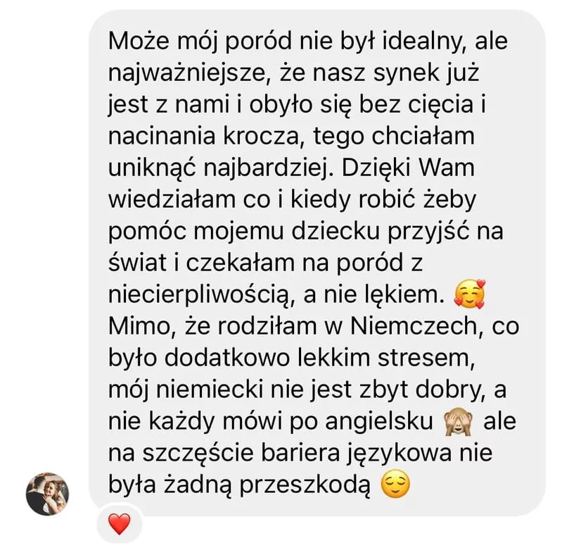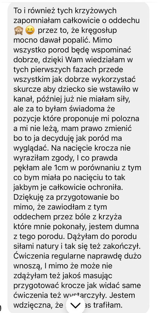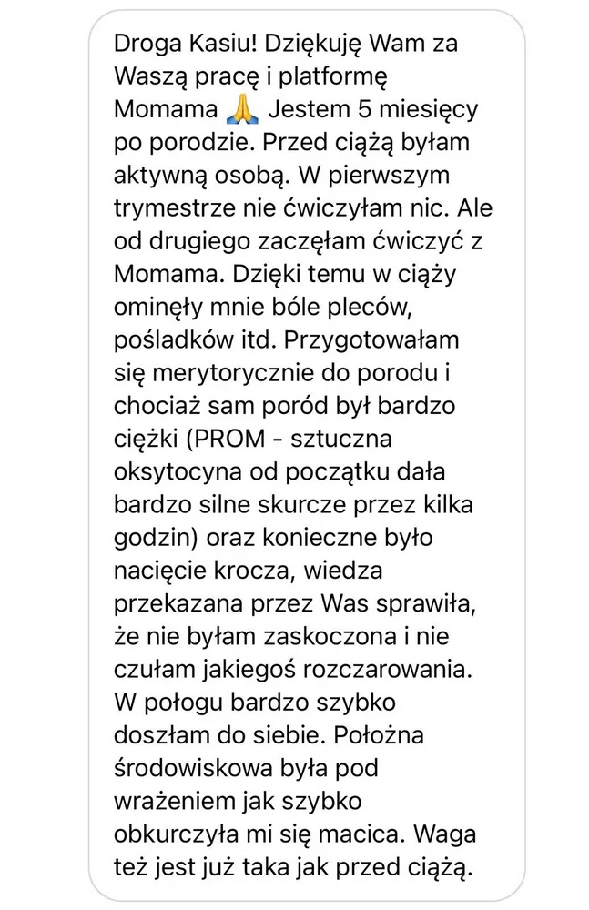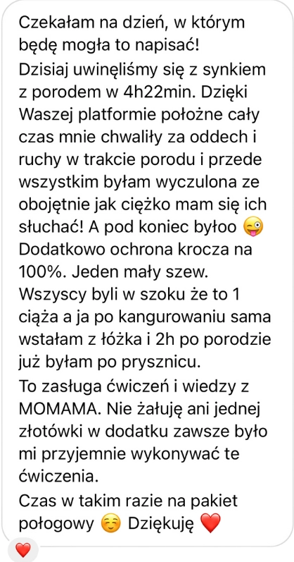 Czekałam na dzień, w którym będę mogła to napisać! Dzisiaj uwinęliśmy się z synkiem z porodem w 4h22min. Dzięki Waszej platformie położne cały czas mnie chwaliły za oddech i ruchy w trakcie porodu i przede wszystkim byłam wyczulona ze obojętnie jak ciężko mam się ich słuchać! A pod koniec było 😜 Dodatkowo ochrona krocza na 100%. Jeden mały szew. Wszyscy byli w szoku że to 1 ciąża a ja po kangurowaniu sama wstałam z łóżka i 2h po porodzie już byłam po prysznicu. To zasługa ćwiczeń i wiedzy z MOMAMA. Nie żałuję ani jednej złotówki w dodatku zawsze było mi przyjemnie wykonywać te ćwiczenia. Czas w takim razie na pakiet połogowy ☺️ Dziękuję"Urodziłam w wybranej pozycji a nacięcie krocza nie było konieczne"